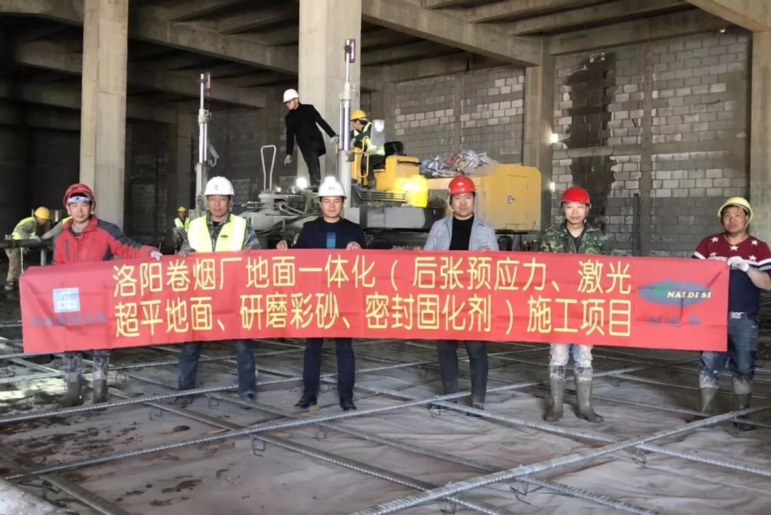 项目:洛阳卷烟厂,耐迪斯与中建五局联合打造15000m²后张预应力整体无缝一体化地坪,项目选用研磨彩砂地坪。
